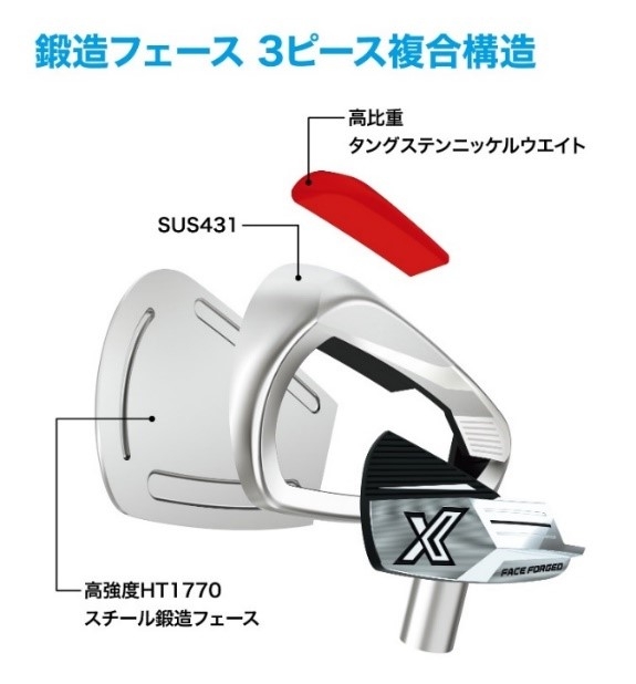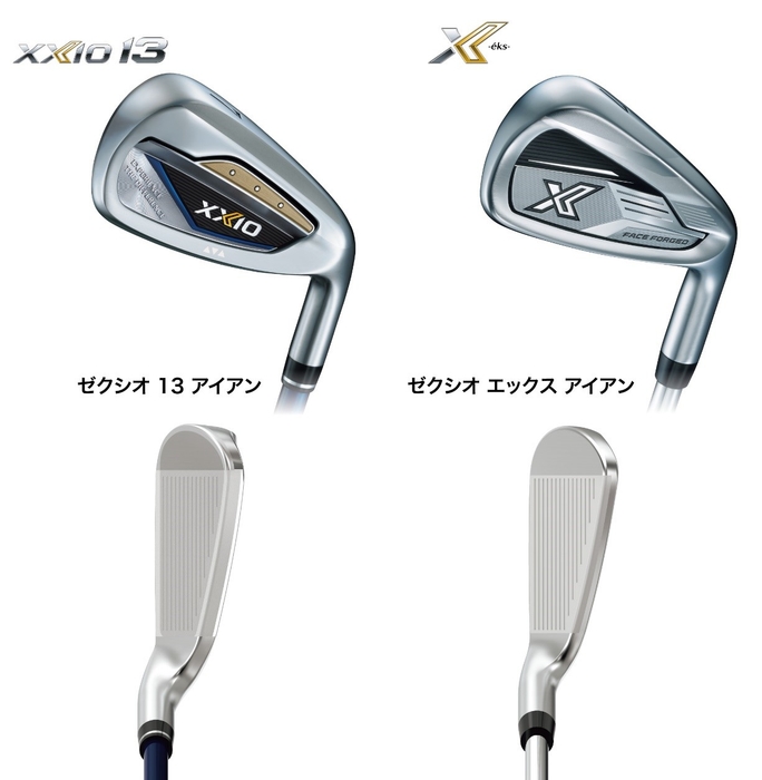 「ゼクシオ 13」は、チタンフェースの4ピース複合構造による徹底した低重心設計とアイアン版「REBOUND FRAME(リバウンドフレーム)」により、高く伸びる弾道をやさしく打つことができます。一方、「ゼクシオ エックス」アイアンは、3ピース鍛造フェース設計で低重心化を実現するとともに、フェース周辺に配置した溝とフェースの肉厚を最適に設計した「MAIN FRAME(メインフレーム)」構造によって鋭く飛び出し、高く伸びる弾道で打つことができます。