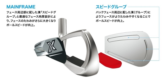 バックフェース周辺部に配置した溝「スピードグルーブ」と、フェースの肉厚を最適設計した「MAIN FRAME」構造によりフェースのたわみがさらに大きくなり、ボールスピードが向上。従来モデル比で+3.0ヤード※1の飛距離アップに成功しています。