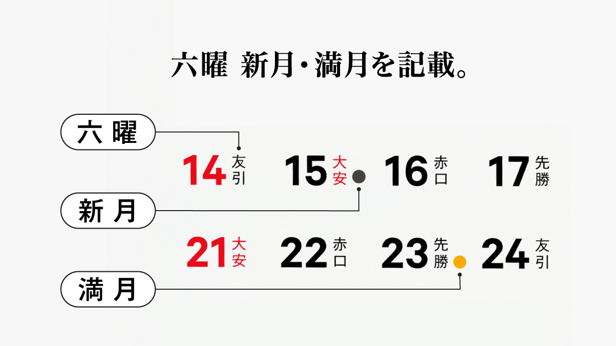 大安・仏滅などの六曜や、新月・満月、元号を記載。予定を立てるのに便利です。