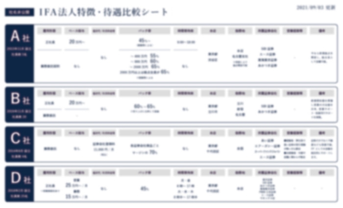 各IFA法人の待遇や報酬条件、取扱商品などを一覧比較することができます。