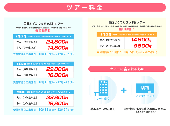 新幹線・特急・普通列車2日間乗り放題きっぷ+ホテル1泊付きで『関西どこでもきっぷツアー』・『西日本どこでもきっぷツアー』
