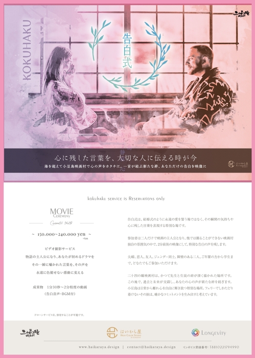 「告白式」は、あなたの心にある大切な想いを、特別な人に伝えるための儀式です。現代社会において、直接言葉にすることの難しさを感じる方々に、このサービスは新たな道を提供します。はいから屋の特別な空間で行われるこの儀式は、ただの告白の瞬間ではなく、あなたの感情や想いを真剣に形にする場です。そしてそれを映画の主人公のように撮影し、永遠と残すことができます。もちろん参加される方は皆さまそんな経験はなく撮影が初めての方向けのサービスですので、どなたでもお気軽にご参加いただけます。