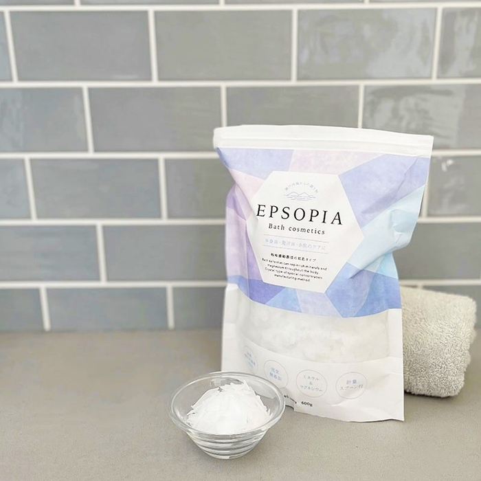 また『エプソピア』は、こだわり抜いた特殊製法を用いた結晶タイプのバスソルトで、風呂釜の故障の原因となる塩分(ナトリウム)を99.5%以上を取り除いている為、追い焚きや、残り湯を洗濯に使用可能です。通常バスソルトは追い焚き機能が使用できない為、『エプソピア』は安心して毎日の温活を続けることができる商品となります。