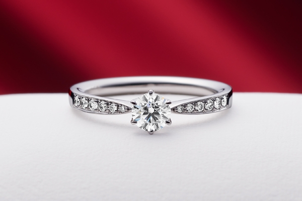 プロポーズ用としてはもちろん、セットリングでも選ばれるトレセンテで人気の婚約指輪です。幸せが溢れる瞬間を表した、まばゆいダイヤモンドのきらめきと、シャープなフォルムが特徴的です。