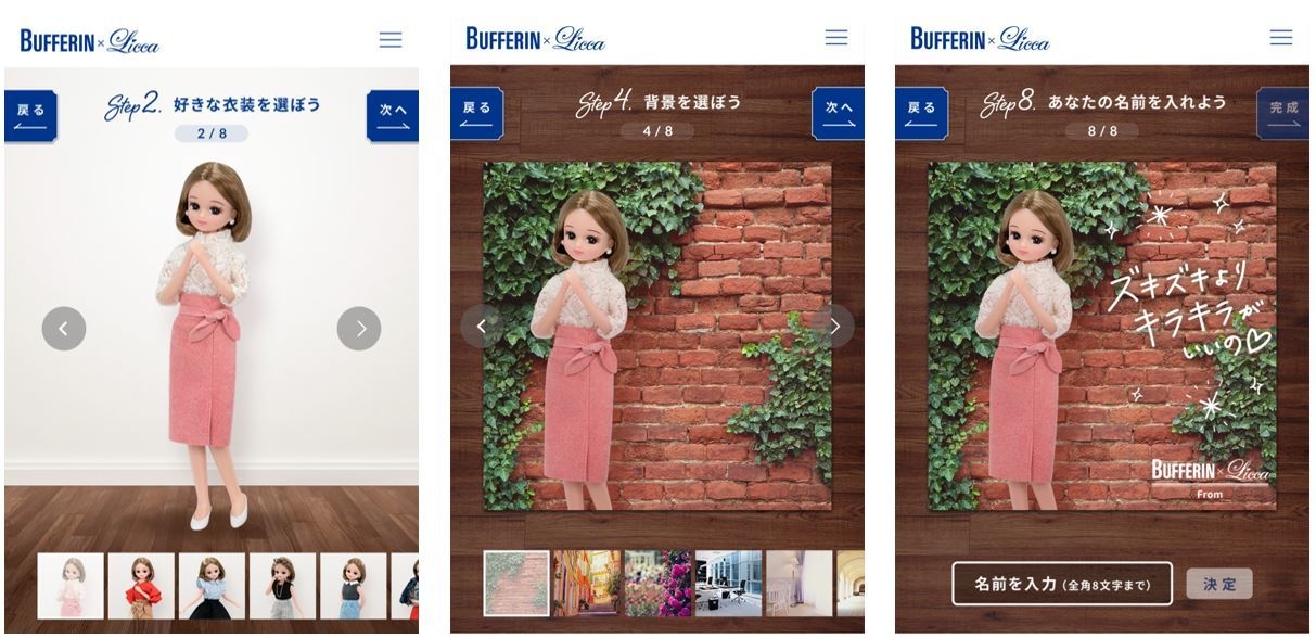 本キャンペーンでは、Liccaとバファリンがコラボしたオリジナルポスターがつくれる「ポスターメーカー」で自分好みのポスター画像をつくり、応募いただいた方の中から抽選で「バファリンアンバサダーLicca オリジナルドール」が1,000名様に当たる企画をご用意しました。「ポスターメーカー」では、Liccaの衣装やポーズ、背景、フィルター等を自由に組み合わせて、自分だけのポスターをつくることができます。OL風の大人っぽいコーディネートや季節を先取りした「春夏」らしいカジュアルなファッションのLiccaをオリジナルのポスターのモデルにすることが可能です。