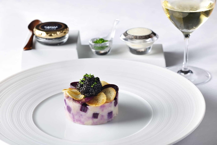 【星のや沖縄】沖縄特産の紅芋にキャビアをあわせた、 沖縄だけのちょっとした贅沢 「明けの贅沢 ~贅沢な一皿~」 「キャビア じゃがいもと紅芋のグラティナート」提供開始|提供開始:2022年7月1日