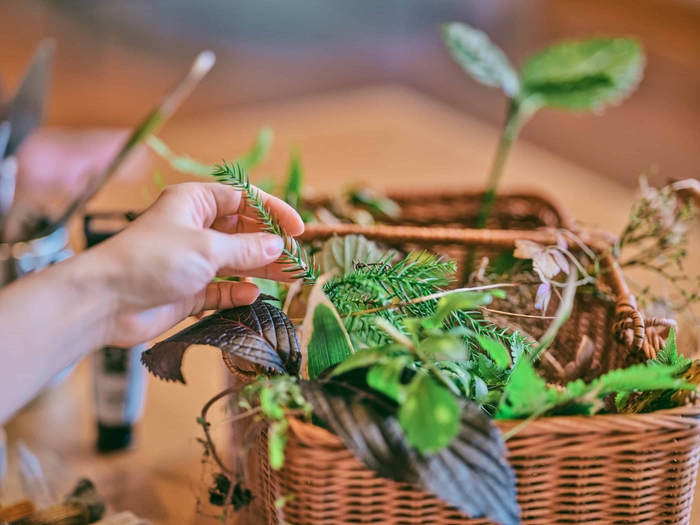 現代アーティストの鈴木氏とのアート制作は、仙石原周辺で採取された自然素材を観察することから始まります。観察する素材はシダなどの常緑樹の葉や季節の草花、木の実や枝などさまざま。それぞれの素材を目で見たり手で触ったりして大きさや形、感触を確かめ、想像を膨らませていきます。