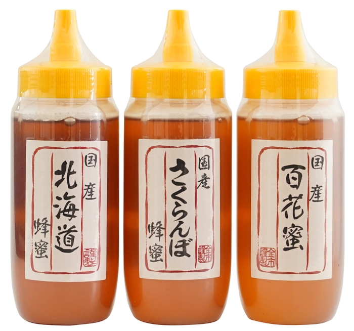 国産さくらんぼ蜂蜜、北海道蜂蜜など。各480g×3本