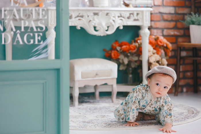 1歳のお誕生日を記念してベビー袴での撮影も可愛らしくておすすめです。初めての袴・お着物デビューになるかもしれないですね♡ベビー袴はウエストがゴムやマジックテープになっていたり、動く赤ちゃんにも着せやすく、赤ちゃんも動きやすい仕様になっています。小さい赤ちゃんでも袴が着れちゃうなんて可愛らしくてとても魅力的です。記念の撮影らしく特別な晴れ着としてのお祝い感も演出することができます。