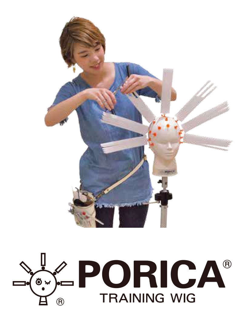 PORICAは世界6ヶ国で特許を取得しているトレーニングウィッグです。カットにおいては足のステップ、体の動きがとても重要です。カットウィッグを使った練習だけでは、立ち位置、スライスの角度、髪の引き出し方がわかりづらかったと思いますが、「PORICA」を使うことで正確に短時間で立ち位置、スライスの角度、髪の引き出し方が身に付きます。また、カット以外の練習もでき、財布に優しく、効率的に上達できます。
