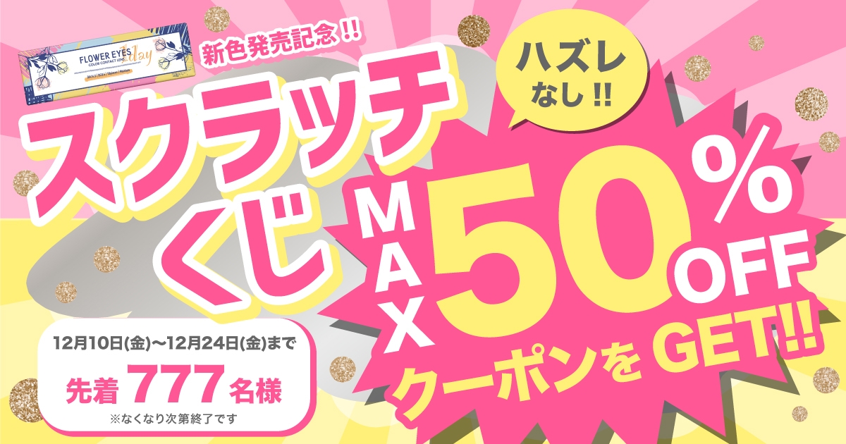このたび株式会社ビューフロンティアは、カラーコンタクトレンズ 「フラワーアイズワンデー」新色3カラーを発売いたします。発売を記念して、12月10日(金)より先着で777名様にハズレなしのクーポンがもらえるスクラッチくじを開催します。ぜひこの機会にご利用ください!