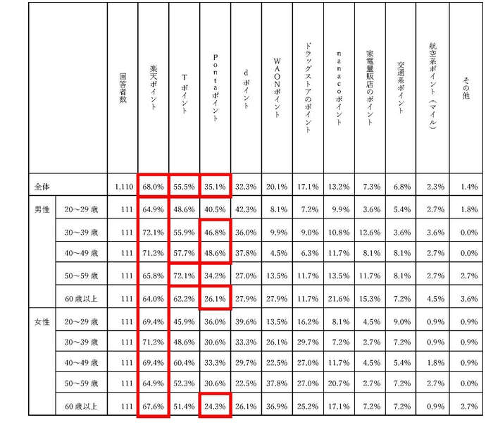 ・これに次ぐ第2位はTポイント(55.5%)で、首位の楽天ポイント同様、年齢・性別を問わず、幅広い層で利用されている結果。なお、 50代男性では楽天ポイントを上回り最多となっている。