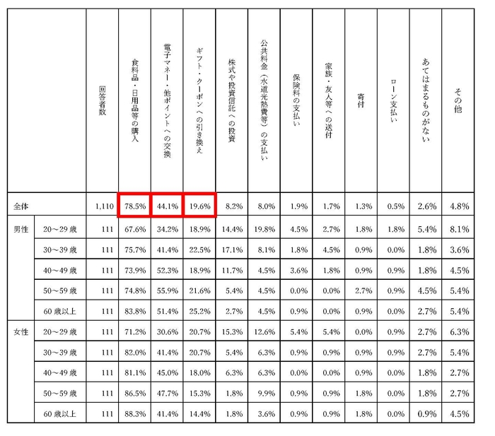 ・ポイントの活用方法として最も多いのは「食料品・日用品等の購入(78.5%)」と予想通りの結果。