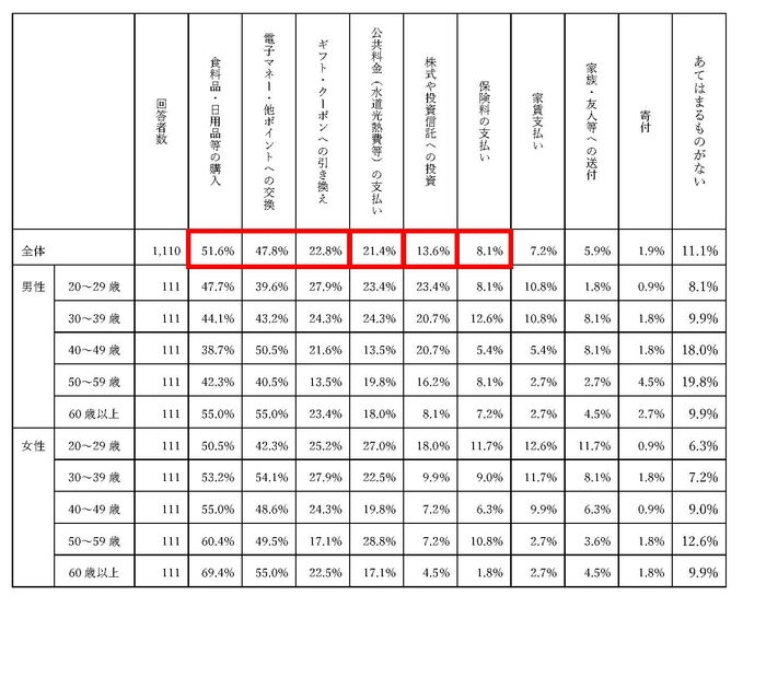 ・また、「株式や投資信託への投資」も13.6%が使ってみたいとしており、「現在の使い道で割合が多いもの」の8.2%からしてみると、一定の伸びしろが確認できる。このほか、「保険料の支払い」を使ってみたいとした割合は8.1%で、現行の1.9%と比較すると伸びしろが大きいことが窺えた。投資や保険など金融サービスとポイント利用には少なからず親和性があることが推察される。