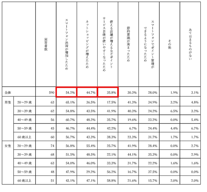 ・なお、第3位は「使える店舗が増えるなどポイントサービス自体が使いやすくなったため」の35.8%で、第4位「節約意識が高まったため」の30.3%をおさえる結果。本調査においては、節約意識以上に利用のしやすさや汎用性が重視されている事実が浮かび上がっている。