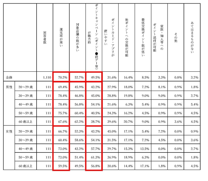 ・男女別で比較した場合、「還元率が高い」を選んだ割合は、男性73.9%、女性66.5%であったのに対し、「ポイントキャンペーン(ポイント●倍デー等)が魅力的」を選んだ割合は男性44.3%、女性54.6%となり、男性がシンプルに還元率を求める一方、女性はキャンペーンを好む傾向が表れた。