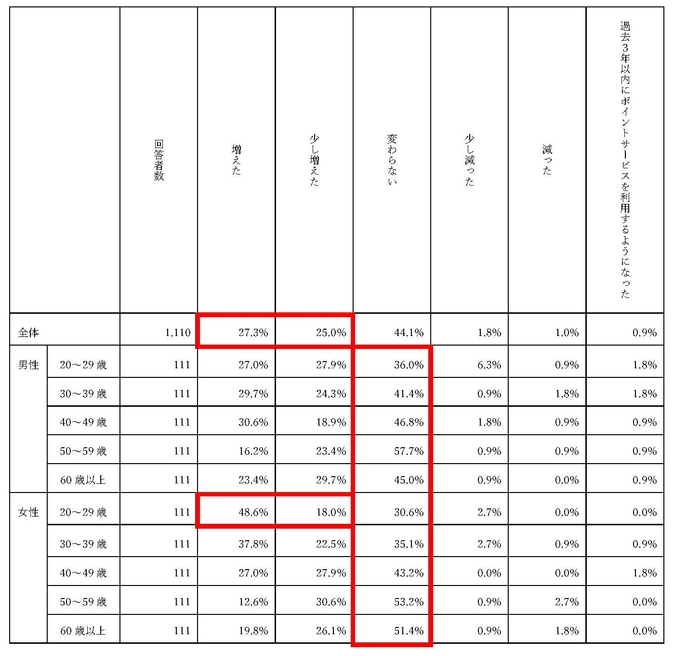 ・ポイントサービスの利用が「増えた(27.3%)」「少し増えた(25.0%)」「過去3年以内にポイントサービスを利用するようになった(0.9%)」の合計が53.2%と過半になっている一方、「少し減った(1.8%)」「減った(1.0%)」の合計がわずか2.8%にとどまっていることから、過去3年程度で顕著に普及していることが窺える。特に、本調査では、20代女性の「増えた」が48.6%、「少し増えた」が18.0%となっており、若い女性層の意識の変化が表れていた。
