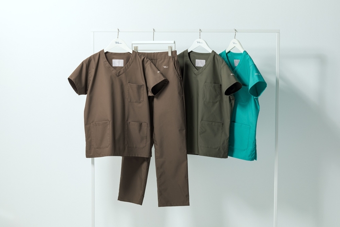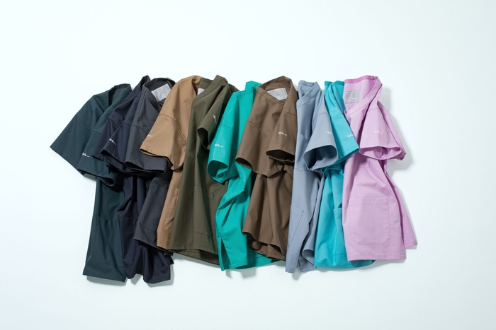 今回登場するのは、スクラブに加わった新色(アクア/ブラウン/カーキ)と、白衣のロゴ刺繍カラーを全7色から選べる新仕様モデル。