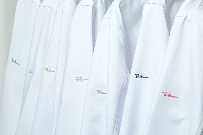 今回初めて、白衣の左肩に施されるRon Hermanロゴ刺繍の色を選べる仕様が登場。これまでの定番ネイビーに加え、カリフォルニアの空や光からインスピレーションを受けた6つを新たに追加し、全7色からお選びいただけます。