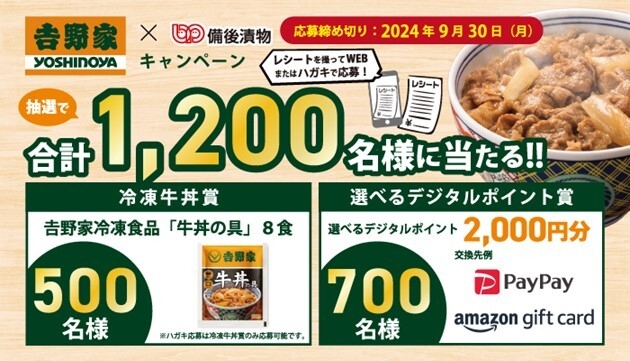 対象商品いずれか一つをお買い上げのレシートでWEBまたはハガキからご応募いただくと、抽選で1,200名様に吉野家冷凍食品「牛丼の具」や選べるデジタルポイントをプレゼントいたします。