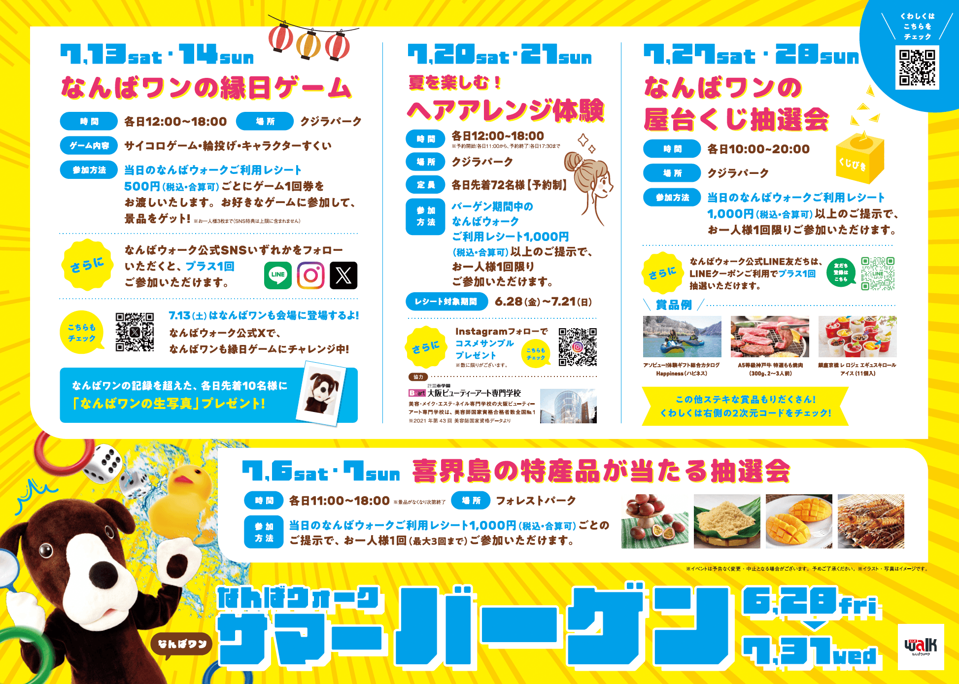 なんばウォークサマーバーゲンが6月28日(金)からスタート! バーゲン期間中の週末は、喜界島の特産品が当たる抽選会、 なんばワンの縁日ゲーム、ヘアアレンジ体験、 なんばワンの屋台くじ抽選会等の楽しいイベントも開催!