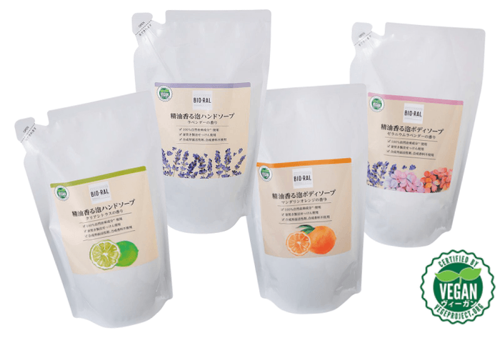 伝統的な釜炊き製法の石鹸を使用した肌に優しい泡タイプで、香りは2種類ずつ展開しております。ヴィーガン認証を取得しており、詰替え用のパッケージや専用ディスペンサーはバイオマス原料を使用しているため、地球にも優しい商品です。