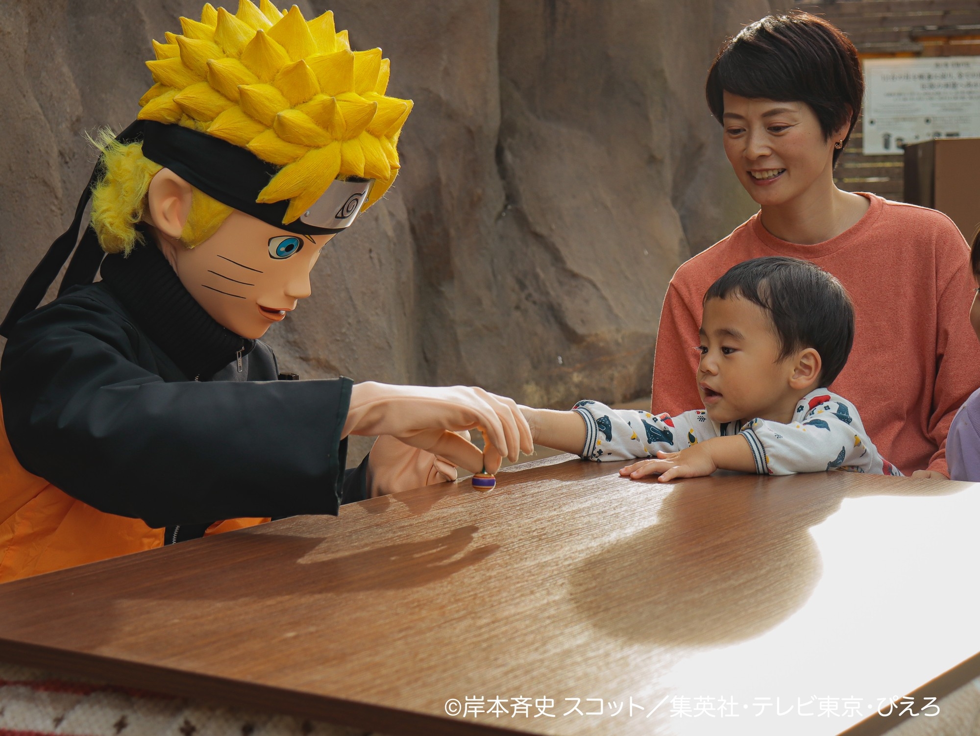 うずまきナルトと独楽回し対決ができるグリーティングイベント。ナルトより長く独楽を回すことができた方には、 ニジゲンノモリオリジナルステッカーをプレゼントいたします