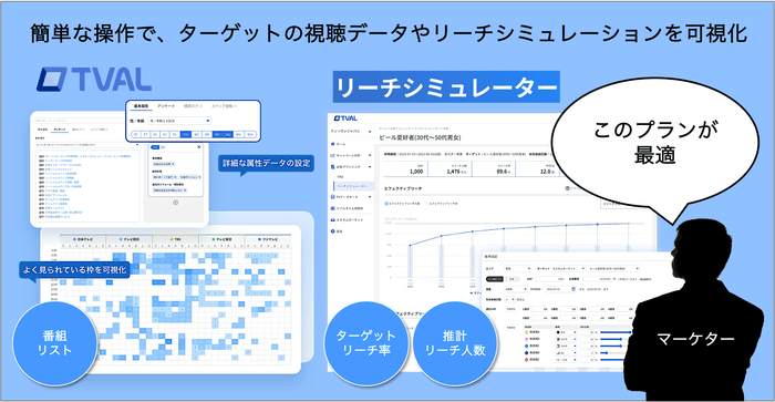 また「リーチシミュレーター」により、GRPや出稿期間を設定するだけで、ターゲットへのリーチを最大化するシミュレーションをダッシュボードに表示。ターゲットに対して最も効果的なメディアプランをデータに基づいて構築することができます。