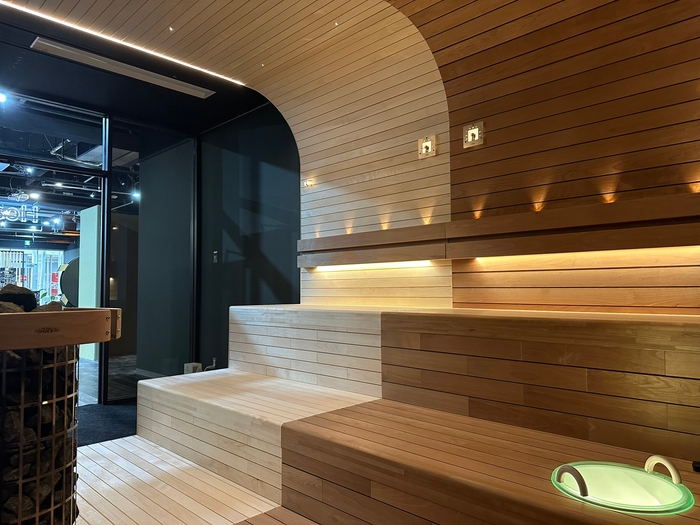 岡山県玉野市の瀬戸内温泉たまの湯では今年二月にサウナ室をリニューアル。サーモリーのサーモアスペンをベンチや床、壁、天井へふんだんに使用したサウナ室内は水や波をイメージしたデザインで、カリッティの照明がその雰囲気を仕上げています。ベンチ下部からムードたっぷりに室内を彩るLED照明の他、15分おきにオートロウリュが作動するヒーター直上にはガラスファイバー照明を設置。ロウリュの蒸気を光で演出します。