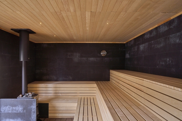 2025年4月にオープンした、北海道札幌市定山渓の休日湯サウナ室には、サーモリーのサーモアスペン材が使われています。節のない美しい外観はサウナ室の世界観を引き立て、滑らかな肌触りがサウナ体験を心地よく彩ります。さらに、サーモリーのサーモウッドは含水率が2~3%と非常に低いため熱伝導率も低く、高温のサウナ室内でも床面の温度も熱くなりすぎません。