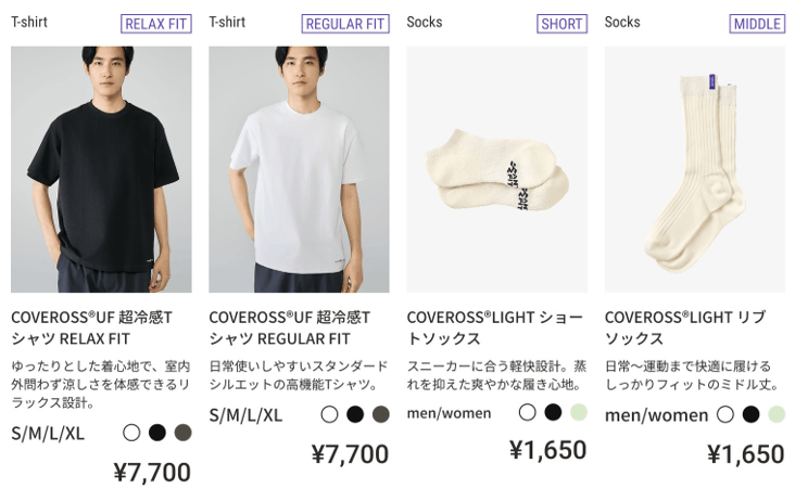 「24時間アクティベートウェア」シリーズは、全てこのCOVEROSS(カバロス)の素材を使用しており、“24時間、全てを快適に変える“をコンセプトに、男女兼用アイテムとしてセットアップをはじめとした全8型をラインアップしております。