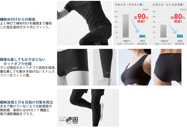 本商品は、よく伸びて締め付けを極限まで緩和した低圧素材を採用、グンゼ独自のカットオフⓇ技術により縫い目による刺激を低減したストレスフリーかつスタイリッシュな新感覚のスポーツレイヤーです。メンズのエアーズボクサー、エアーズブリーフのフロント部分とトップスの脇部分には通気性の高いメッシュ素材を採用。レディスのハーフトップとハーフショーツは縫い目のない接着仕様で、より快適な着心地にもこだわりました。素材にはUVカット機能と吸汗速乾機能をプラスし、日焼けと汗対策も両立しています。スポーツで日々のストレスを解消し爽快感を味わいたい方、健康維持のために適度な運動を取り入れたい方に、長時間着用してもストレスを感じにくい新時代のスポーツレイヤー「AIRZ sports」が、新たなスポーツスタイルを提案します。