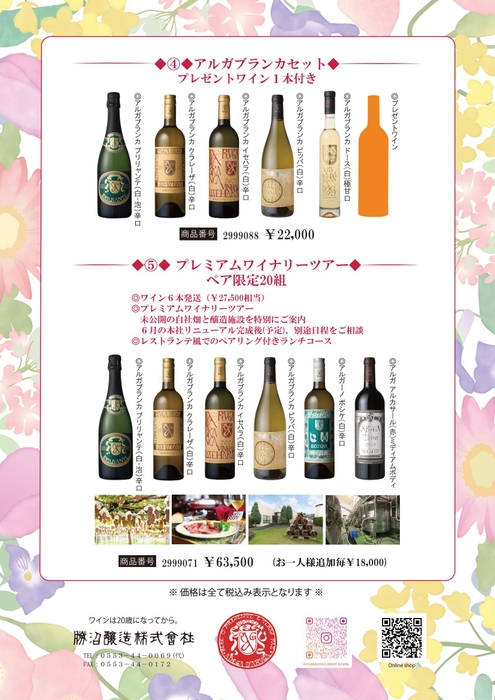 下記対象のワインセット20,000円(税込)以上ご購入の方を対象とし、ワイナリーで最適保管された白ワインを1本贈呈。また6月頃予定のワイナリーリニューアルオープンに伴い、プレミアムなツアーを20組限定で用意しております。