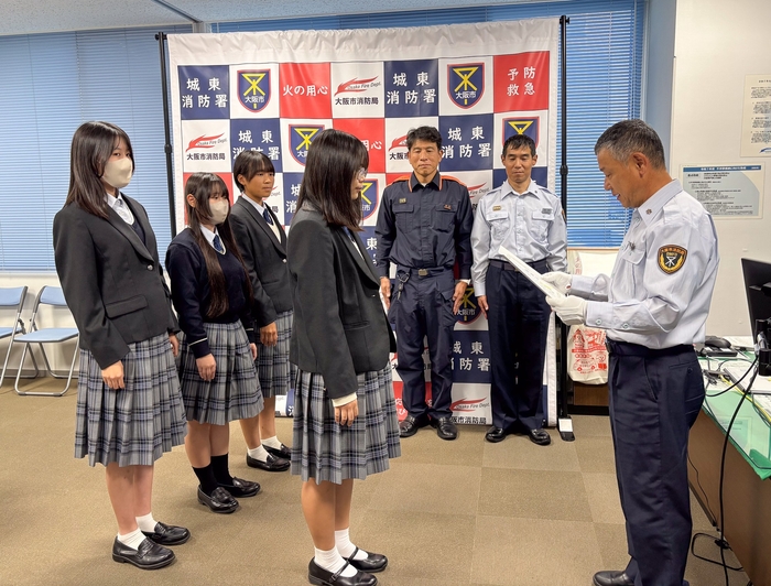 大阪信愛学院高等学校(大阪市城東区)の生徒5名が、2025年10月24日(金)、大阪市城東消防署から感謝状を贈呈されました。生徒たちは9月に発生した火災現場で迅速な初期対応と避難救助活動を行い、その勇気ある行動が評価されました。