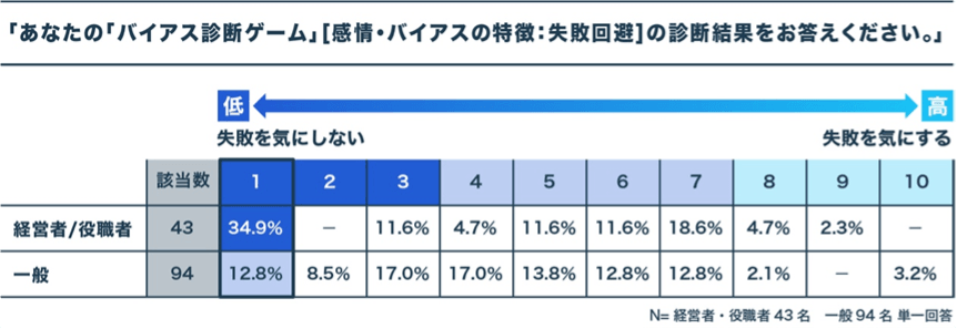 失敗に関する感度であるバイアス❝失敗回避❞において数値が低いと、失敗を気にしない性質があります。企業において責任のある立場の経営者・役職者層に絞って特徴を見てみると、10段階の中で最も低い1の回答が34.9%となり、「失敗を気にしない」人に偏ることが判明。