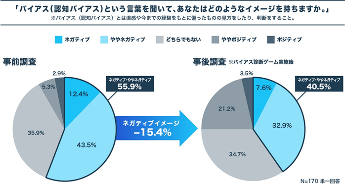 ●「バイアスについてのネガティブなイメージ」、バイアス診断ゲーム実施後、55.9%から40.5%まで減少