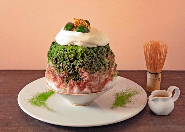 福岡県八女産の抹茶を贅沢に使い、抹茶の苦味とあずきシロップのバランスが良い定番のかき氷です。白味噌ムースをかけているのでコクがあり、かき氷の中にはゆずシャーベットや抹茶ゼリーなど最後までお楽しみいただけます。