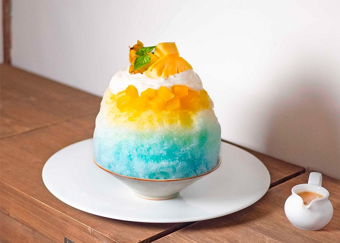 石垣島ティダパインを贅沢に使用しました。爽やかな見た目と、ココナッツシロップやジャスミンゼリーの香りも楽しめるかき氷です。8月末まで提供予定です。