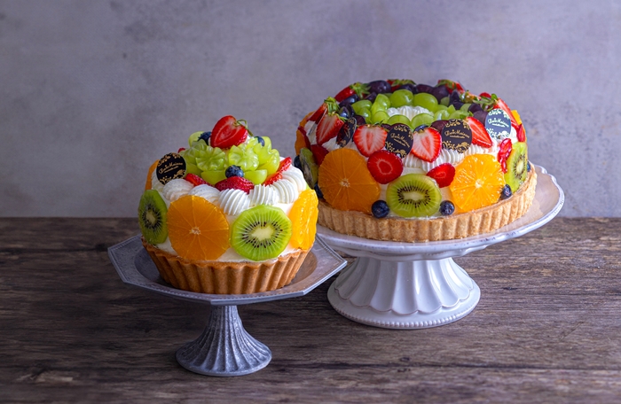 シャインマスカットといちごをふわふわのスポンジとやさしい甘さのホイップクリームでサンドし、カスタードタルトに重ねました。5種類のフルーツを華やかに飾ったアニバーサリー限定のタルトです。