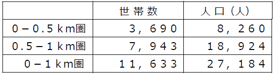 ・店舗から1㎞圏内は、単身世帯比率が32.9%、2人世帯が33.3%と全体の7割弱が少人数世帯です。