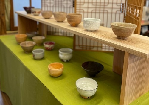 抹茶とコーヒーを提供いたします。器はいずれも萩焼で、何種類もある器の中からお客様がお好みの器を選び、その器でお茶を楽しんでいただけます。