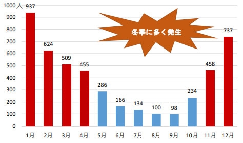 高齢者の浴槽内での不慮の溺死及び溺水による死亡事故のうち発生月が分かっている4,738件を見ると、高齢者の入浴中の事故は、1月をピークに11月~4月、特に冬季に多く発生しています。