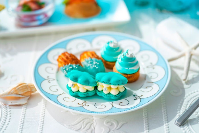 メレンゲの珊瑚がのったグレープフルーツ味のオーシャンゼリー、真珠貝をかたどったレモン風味のマカロン、ココナッツのムース、巻貝に見立てたガレットなど、珊瑚や貝殻などのモチーフとオーシャンブルー×ホワイトカラーの涼しげなスイーツに加え、クロワッサンのスモークサーモンサンド、海苔塩ポテトフライなど海の幸を使用したセイボリー、2種のスコーンとともに、紅茶やハーブティーも飲み放題でご提供いたします。