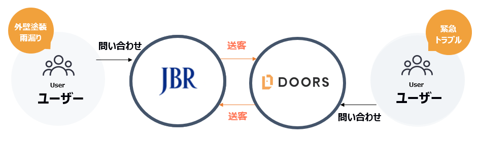 今回の提携により、相互送客が可能となります。具体的には、JBRに寄せられる外壁塗装、屋根塗装、雨漏りなど住宅設備に関する相談に関して、ドアーズへの送客が可能となります。また、ドアーズに寄せられる緊急性の高いトラブル(カギ、水まわり、ガラス等)に関しては、JBRに送客していきます。これらの相互送客により、双方の得意領域を活かすことで、ユーザー課題への解決力向上を目指していきます。