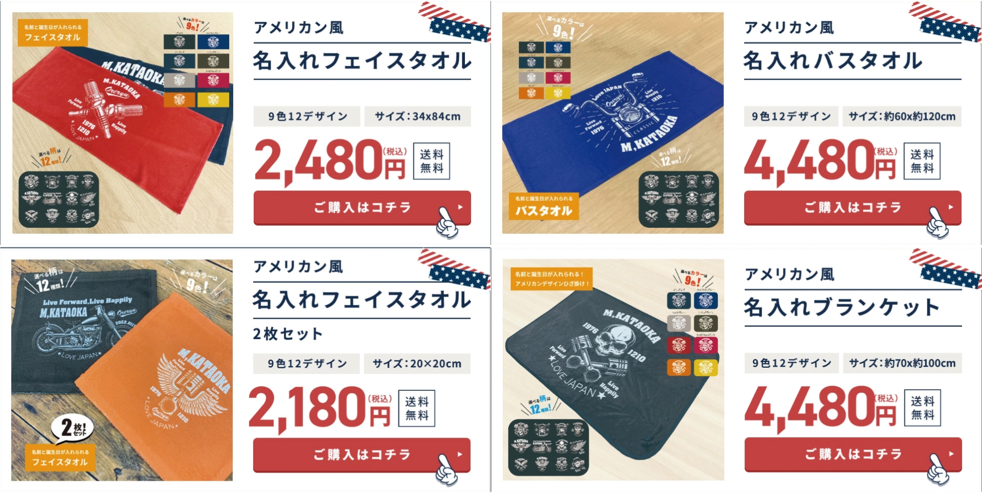 アメリカンシリーズは、カスタマイズ可能なデザインが特徴のラインナップです。デザインはバイクやエンジン、ピストンなど、アメリカンカルチャーにインスパイアされた力強いモチーフが揃っています。これらのデザインにお名前や日付を入れることができ、オリジナルのTシャツ、パーカー、タオルなどを作成できます。アメリカンスタイルのクールなアイテムで、個性を表現できるだけでなく、特別なギフトとしても喜ばれること間違いなしです。