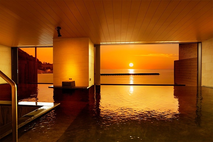 オーシャンフロントのホテルでは、駿河湾の穏やかな景色をゆったりとご堪能いただけます。2階にある「海の見える大浴場」からは、西伊豆の輝くような夕日をお楽しみください。