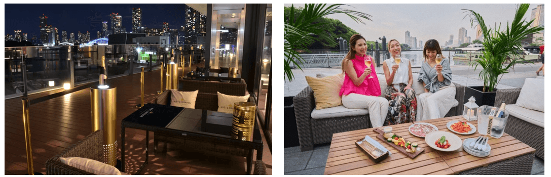 同じくタワー棟3Fのシンガポール・シーフード・リパブリック東京では、テラス席で美味しい料理に舌鼓を打ちながら夜景と音楽が堪能できます。シアター棟1Fにあるエンターテインメントベニュー「BANK30」では、野外エリアにラグジュアリーシートを完備。まるでリゾート地にいるような優雅な時間をご堪能いただけます。
