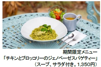 下記に掲載の、「30th Anniversary 森の音ボタニカルフェア」期間は、新緑の季節にぴったりな「チキンとブロッコリーのジェノベーゼスパゲティー」(スープ、サラダ付き。1,350円)を提供しています。
