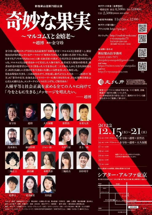 新宿梁山泊第73回公演『奇妙な果実 ~マルコムXと金嬉老~』が2022年12月15日 (木) ~2022年12月21日 (水)にシアター・アルファ東京(東京都渋谷区東3-24-7B1F)にて上演されます。チケットはカンフェティ(運営:ロングランプランニング株式会社、東京都新宿区、代表取締役:榑松 大剛)にて11月15日(火)12:00より発売開始です。