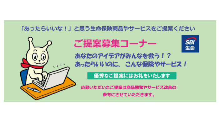 SBI⽣命保険株式会社(本社:東京都港区、代表取締役社⻑:⼩野尚、以下「当社」)は、2021年度上半期に「ご提案募集コーナー(以下「当コーナー」)」へお寄せいただきましたご提案について厳正な審査を⾏い、この度、受賞者を決定いたしましたので、お知らせいたします。当コーナーの受賞者選定は、今半期で5回⽬となりました。今回は、出産・⼦育てに対する経済的不安への保障についてのアイデアや、いじめ・ハラスメントに関するアイデアについて、数多くご提案が寄せられました。また、SBI グループ各社の商品・サービスを活かしたご提案もお送りいただいております。多岐にわたるユニークなアイデアをお寄せいただいたことに厚く御礼申し上げます。当社は、経営⽅針として掲げる「顧客中⼼主義」のさらなる徹底を図るとともに、イノベーティブを⼀層志向していくべく、引き続き当コーナーを通じてお客さまのニーズの把握に努め、新たな商品やサービスの開発や改善を図ってまいります。